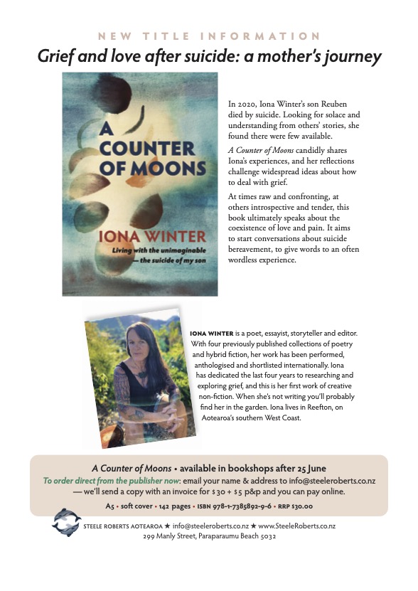 A Counter of Moons shares my initial grief experiences, after my son Reuben Winter took his life in 2020. Each chapter explores a complex mix of emotions, and reflects upon widespread ideas about how to deal with grief. Ultimately, this is a book about the coexistence of love and pain, when someone beloved takes their life. A Counter of Moons aims to start conversations about suicide bereavement, and to give words to an often wordless experience.